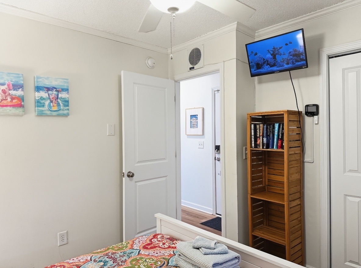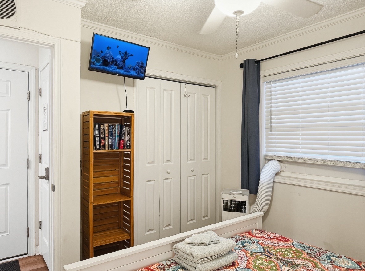 Primary Bedroom: Queen bed, wall-mounted TV with cable, closet, portable AC