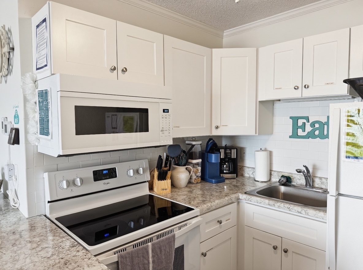 Refrigerator, stove/oven, microwave, toaster, coffee maker